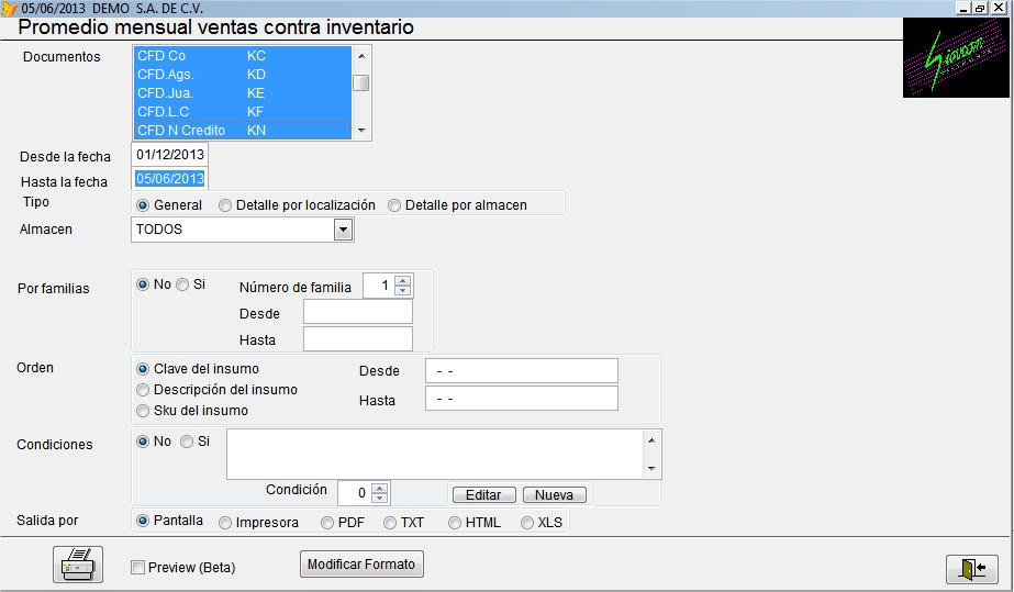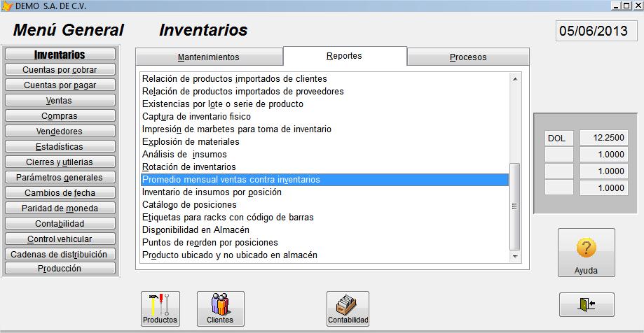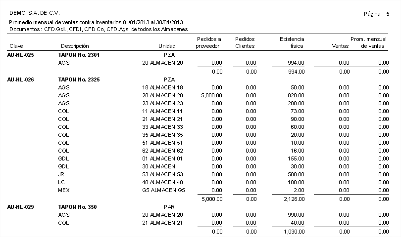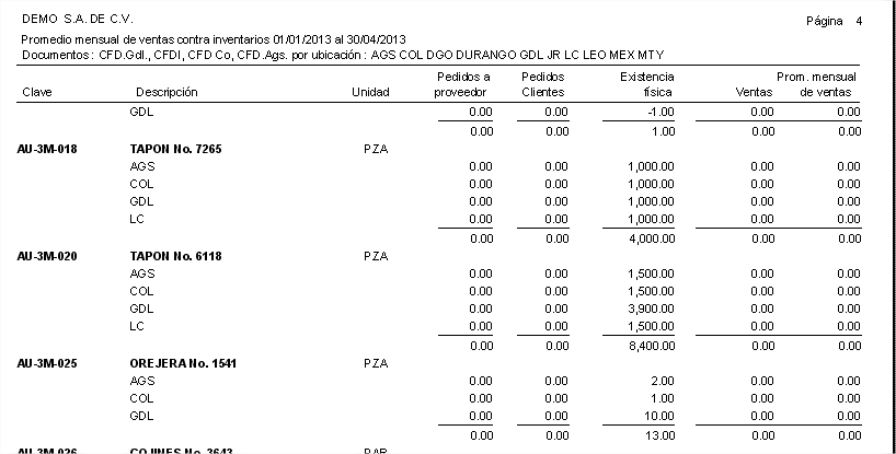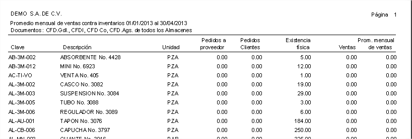 Este reporte nos proporciona la existencia física, las ventas y promedio mensual de ventas por productos, almacén y/o localización del almacén, ya sea general o detallado.